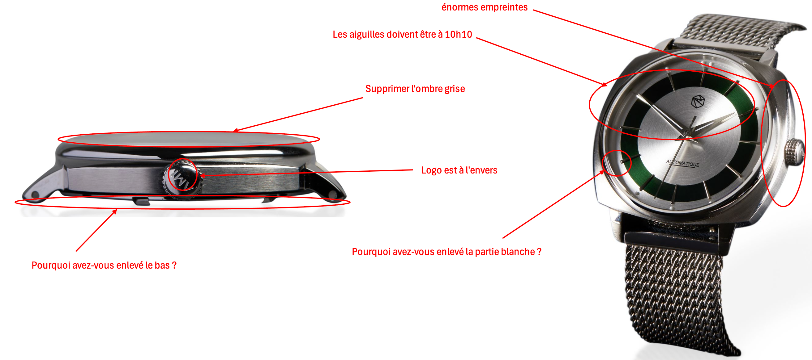 Mon photographe de burgers, lui, n’avait pas cette rigueur. Le résultat était catastrophique. Il avait même effacé certaines parties de la montre lors des retouches ! Le boîtier était couvert d’empreintes, le logo à l’envers, et malgré ma demande de régler les aiguilles sur 10h10 (comme le font toutes les grandes marques), il les avait mises à 1h50.