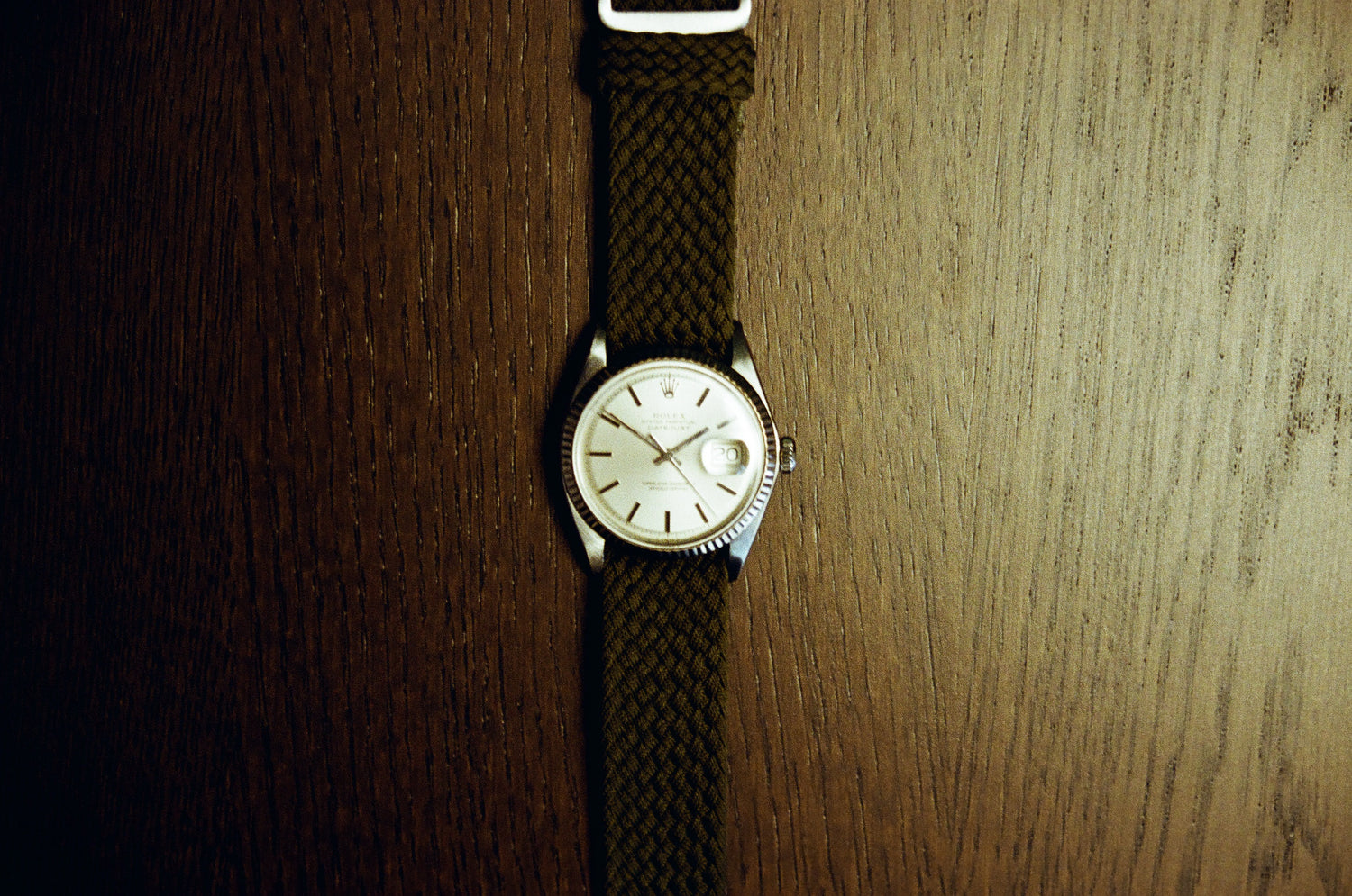 When I look at my collection, the common thread is “elegant minimalism”. My 1972 Rolex Datejust 1601, which I got for my wedding, is a perfect example: timeless design, clean lines, and versatility. You can pair it with any strap—my khaki Perlon strap makes it look stunning.