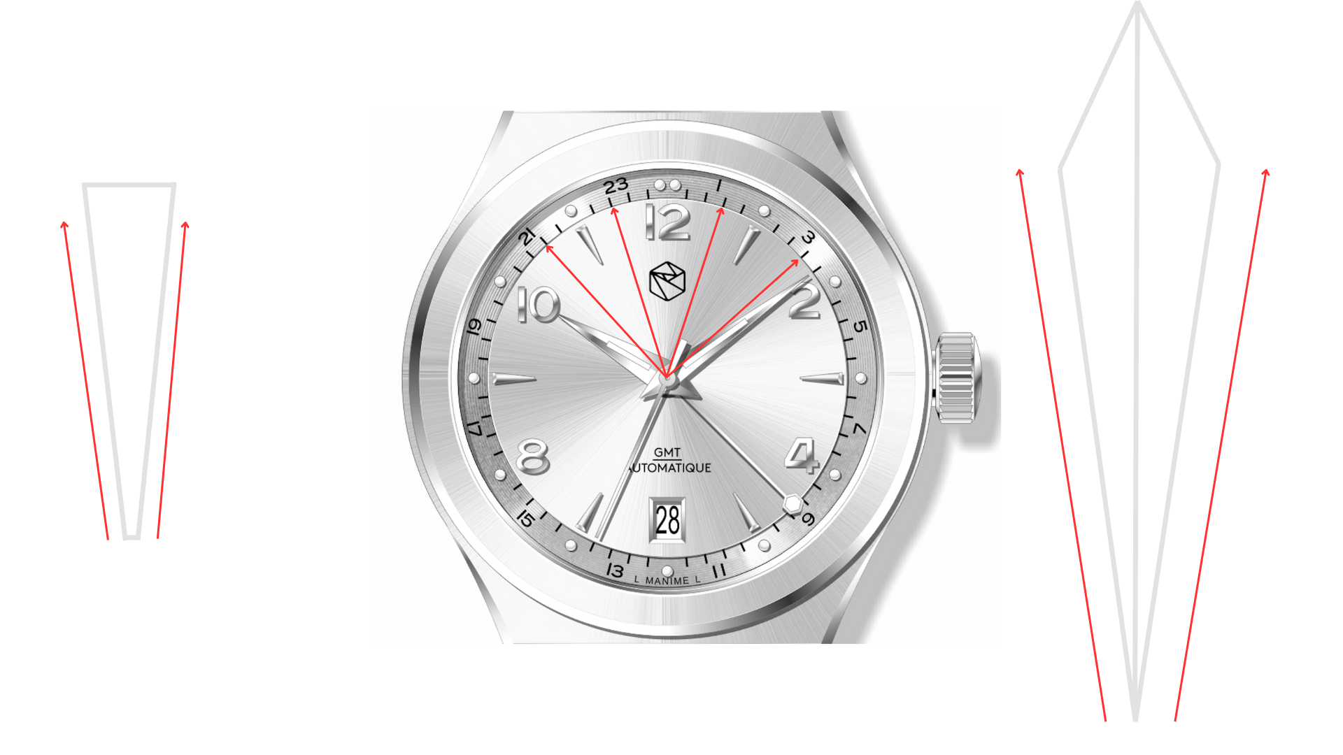 One of them is the second hour hand. I originally designed it as a classic arrow-style hand, the kind you see on many GMTs. But my wife made a suggestion (and let’s not tell her she was right): why not use the shape of our logo?