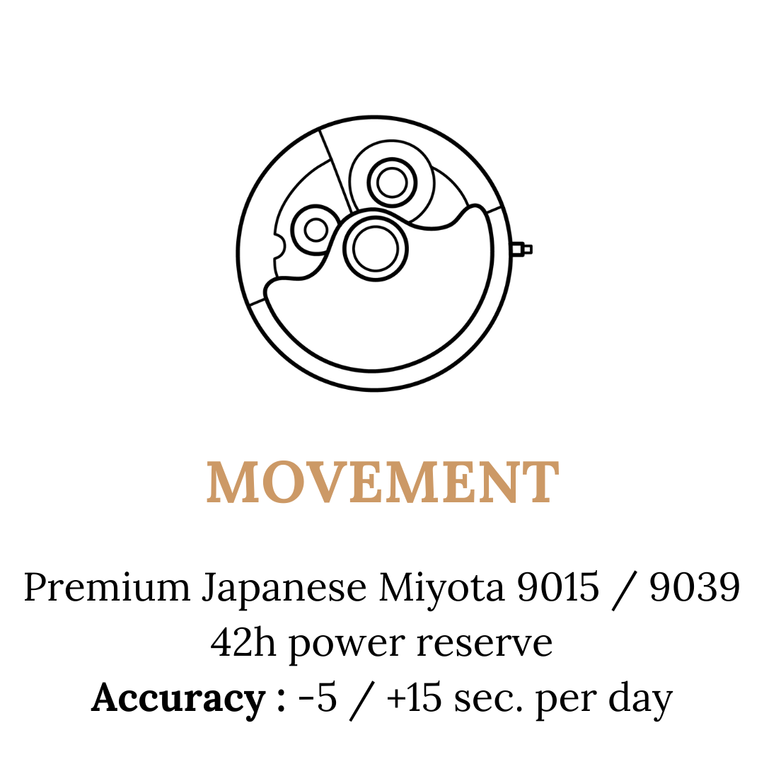 - MOVEMENT: Automatic premium Japanese Miyota 9039 and 9015 (Date)