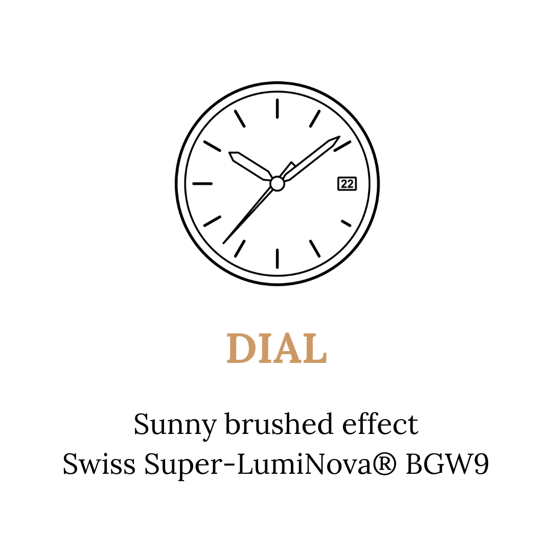 - LUME: Swiss Super-LumiNova® BGW9 / Military version : Colored Swiss Super-LumiNova