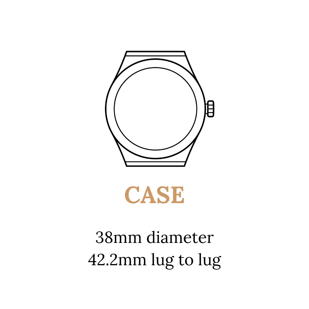 - DIMENSIONS: 38mm and 42.2mm lug to lug