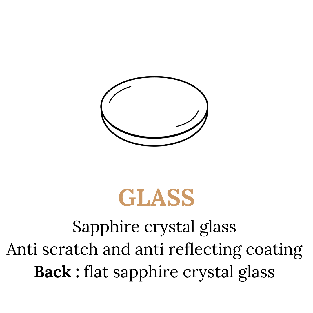 - GLASS: Ultra-resistant and anti-scratch sapphire crystal glass with anti-reflective coating, Back: Flat sapphire crystal glass