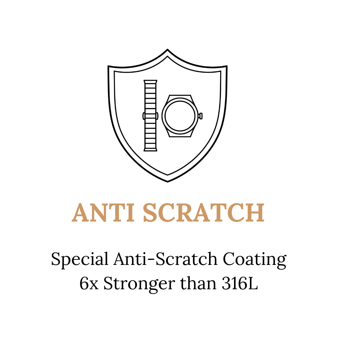 Crafted from premium 316L stainless steel, we have applied a special hardening treatment of 1200HV on the Vickers hardness scale, six times stronger than standard 316L stainless steel, significantly boosting the scratch resistance.