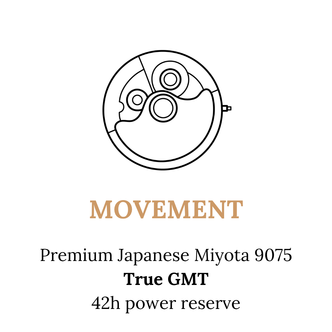 We selected Miyota, celebrated for their precision and dependable performance, to equip LA MÉRIDIENNE with their True GMT premium automatic 9075 movement.