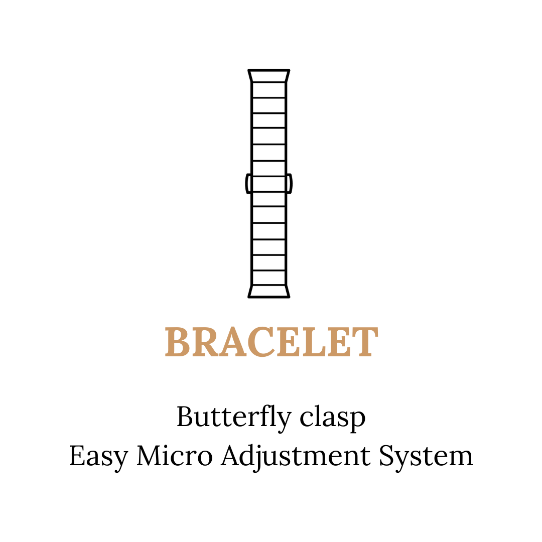 The bracelet tapers from 22mm to 16mm and features a butterfly clasp with micro-adjustments—without any tools simply unclip to adjust the length, ideal for tropical climates or long flights.